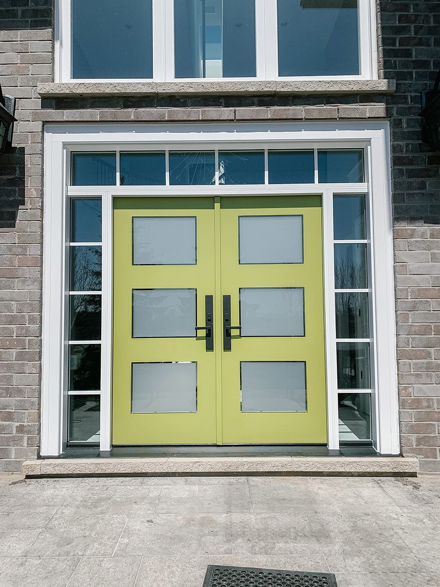 Our client went all out to make an impressive new statement piece in their home–and wow, it’s something! They chose a 3-panel glass fiberglass door with sidelights and transom and painted it bold, Benjamin Moore ‘Split Pea’. Talk about a transformation; this one takes you from “old” to “bold”! Stop and look–one glance, and you’ll see why it’s an assured showstopper.