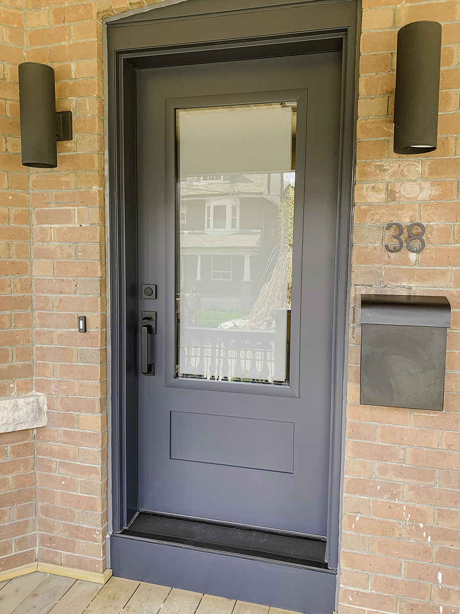 Marine Dusk shake-style door with frosted glass accents installed in a Toronto home