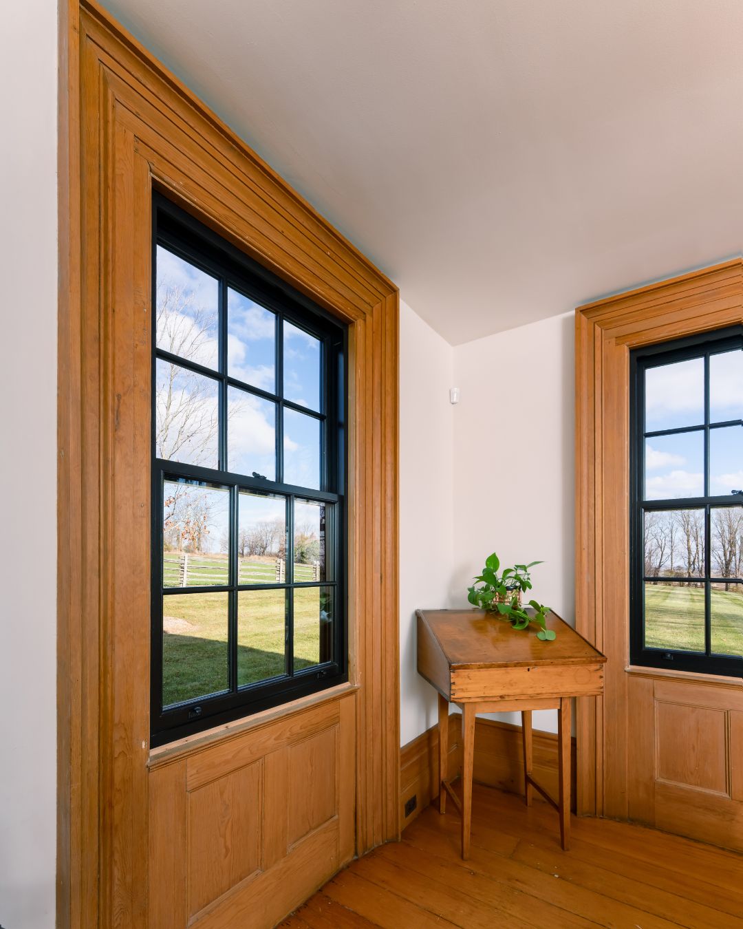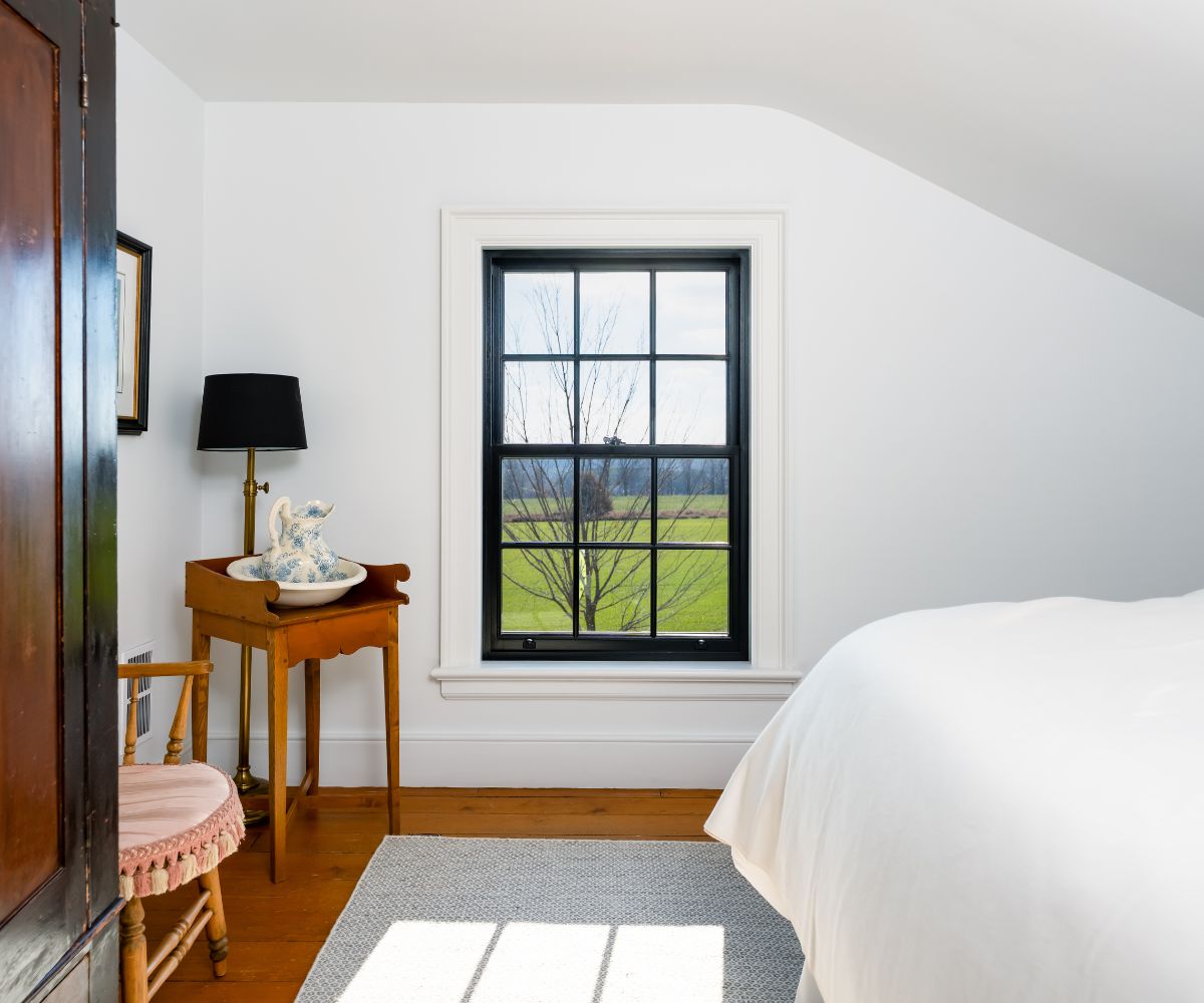 For this project, we installed metal-clad wood single-hung windows finished in black, a colour choice that adds contrast and definition while still feeling timeless. The single-hung style keeps the look clean and traditional, and the SDL (simulated divided lite) detailing gives a subtle nod to the farmhouse’s original window patterns. From the exterior, the windows feel grounded and intentional. Inside, the wood brings warmth that suits the age of the home.