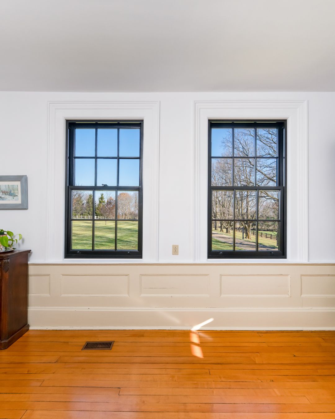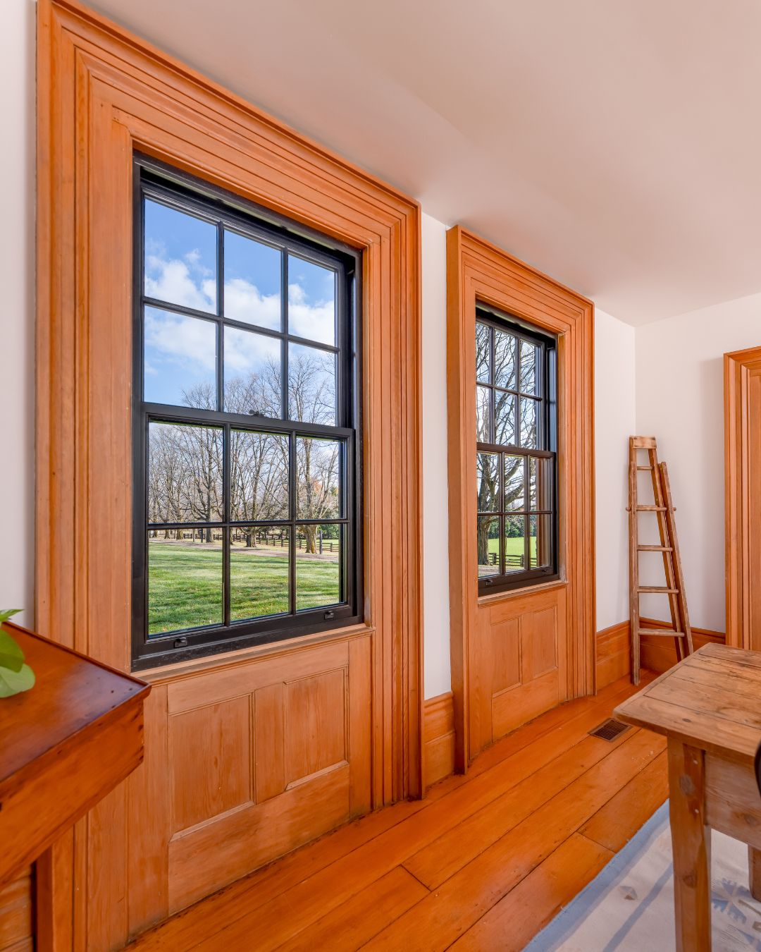 A close-up of two metal-clad wood windows showcasing the original trim work, blending modern functionality with classic design.