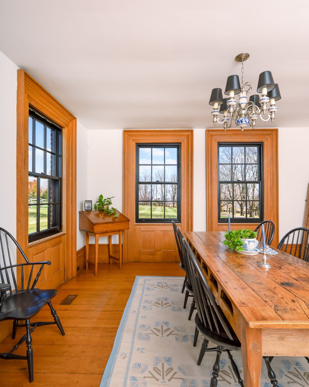 A dining room with a metal-clad wood window framed by original trim, with a wooden dining table set beneath it.