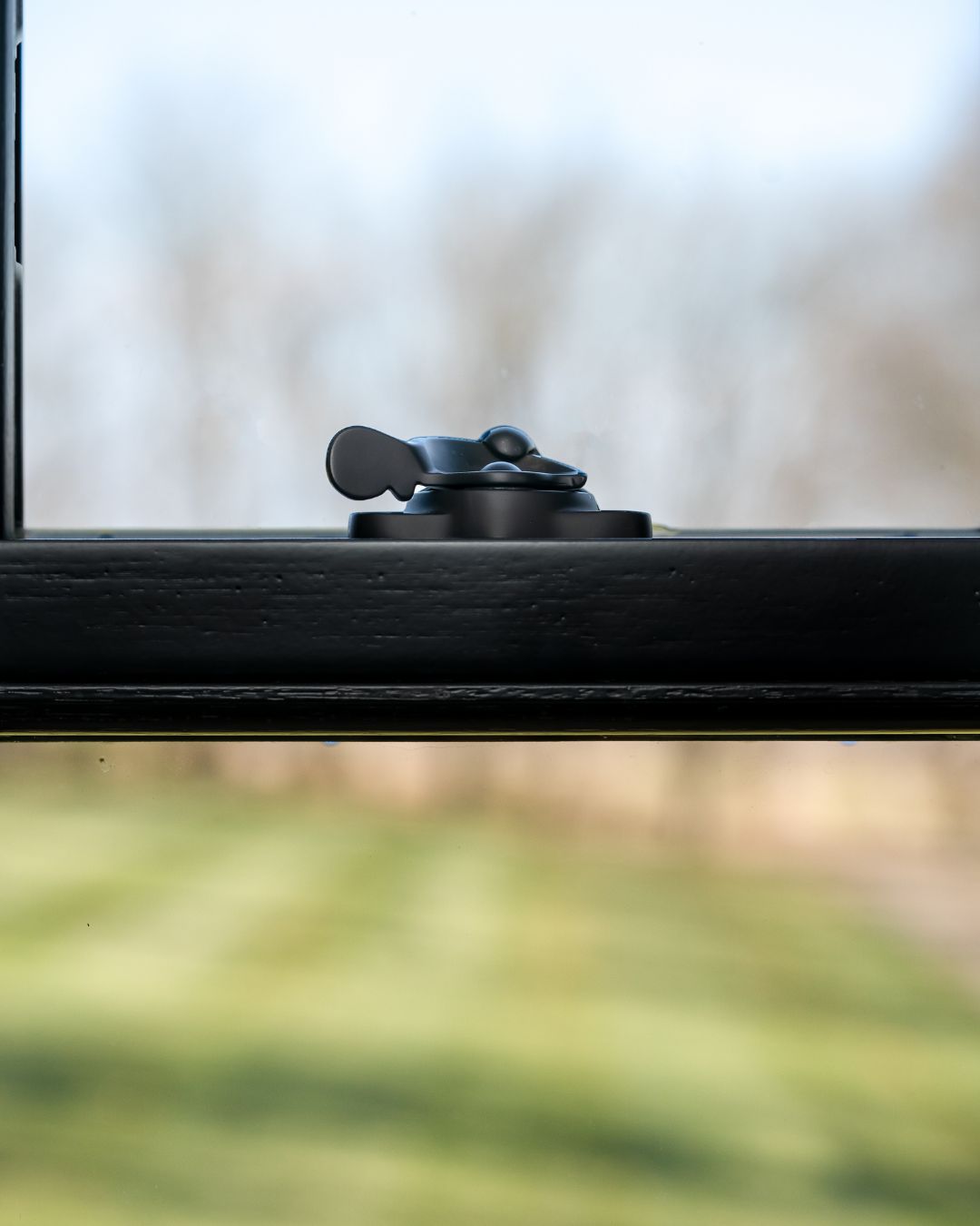 A close-up of sleek, modern window hardware on a metal-clad wood window.
